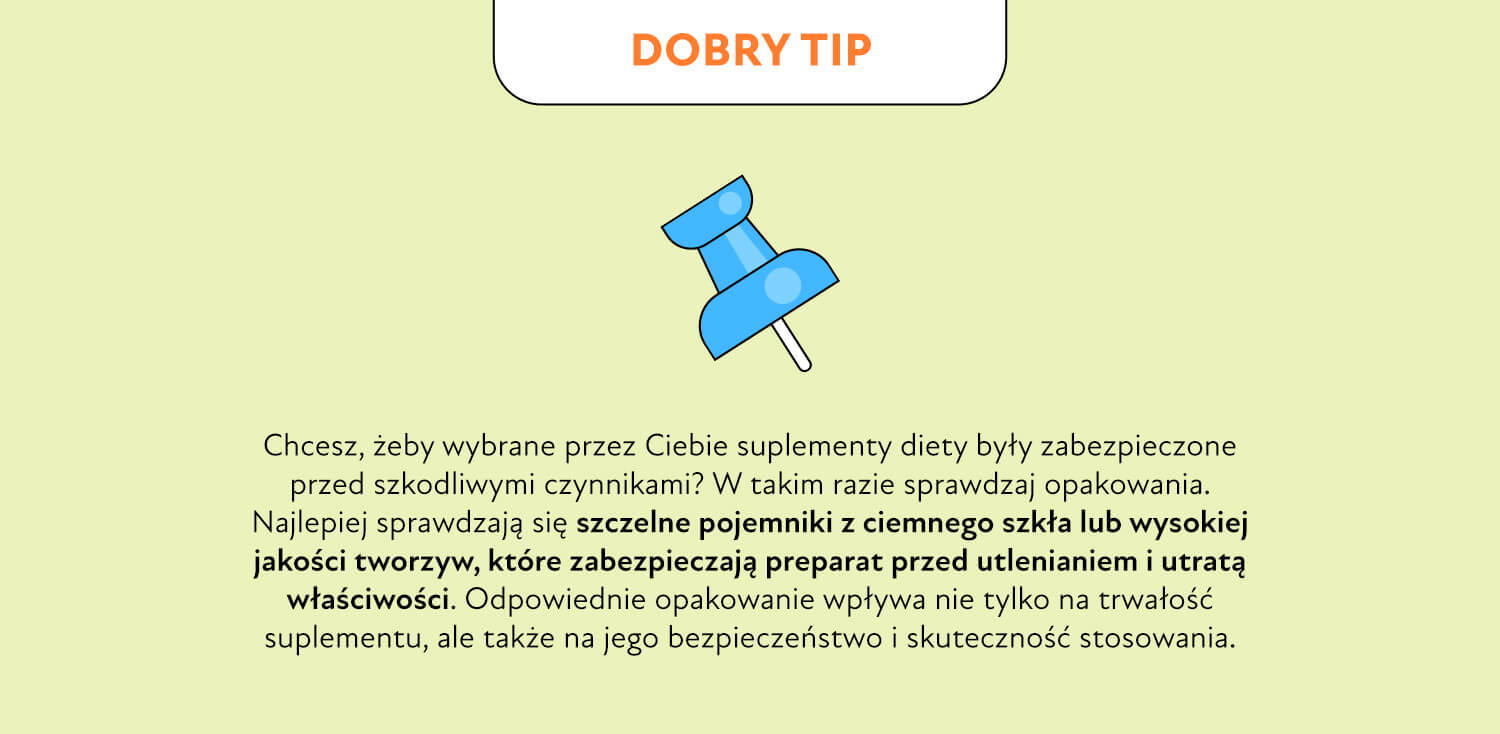 Oryginalne opakowanie jest zaprojektowane tak, aby chronić zawartość przed światłem, wilgocią, powietrzem i wahaniami temperatury. Przesypywanie suplementów do innych pojemników zwiększa ryzyko kontaktu z wilgocią, przyspieszonego utleniania i zanieczyszczeń. Organizery (pillboxy) warto traktować tylko jako rozwiązanie krótkoterminowe, np. na 1–2 dni.