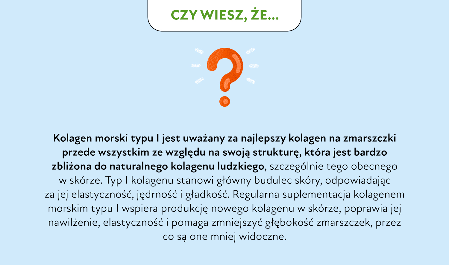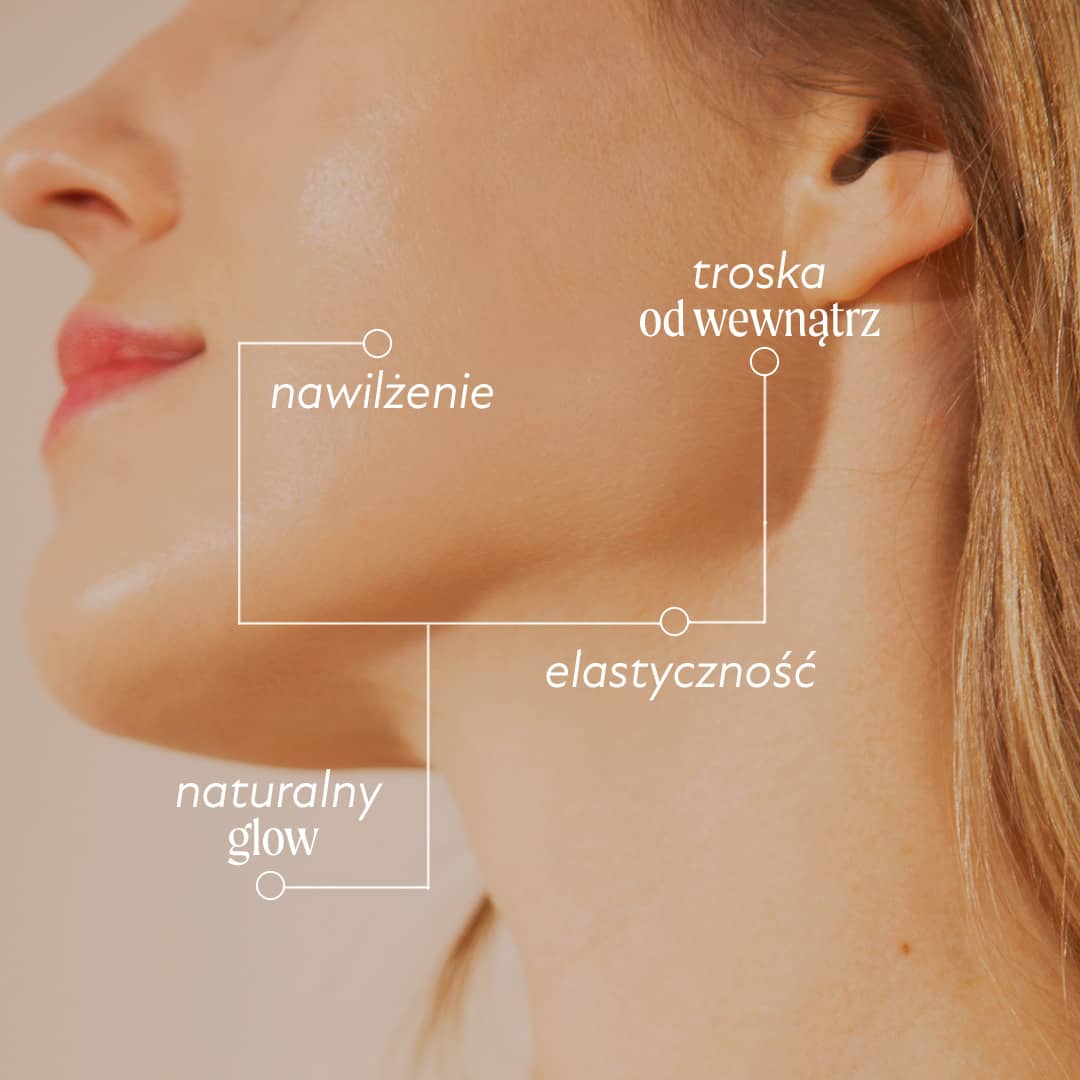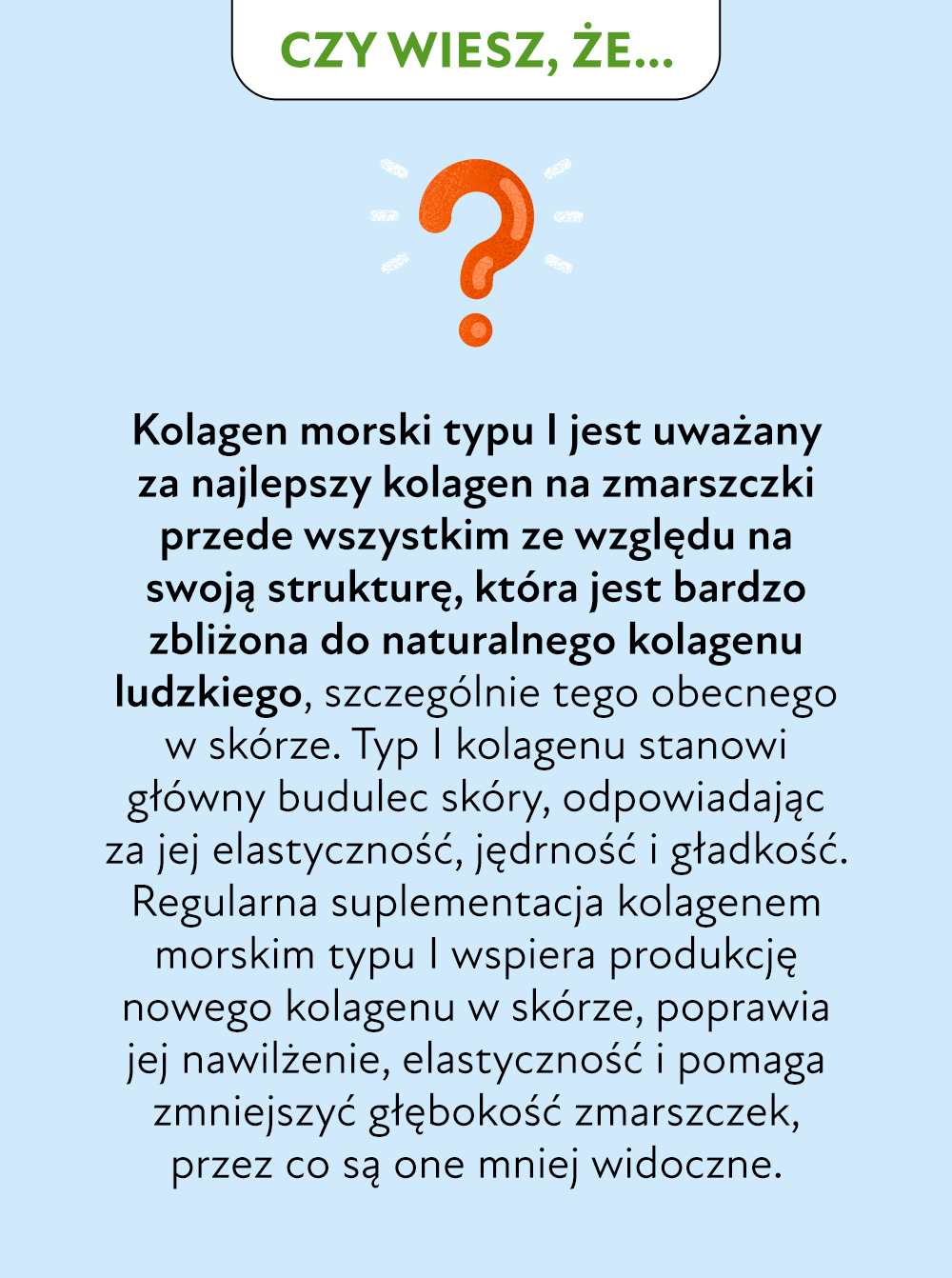 Kolagen działa w skórze jak naturalne rusztowanie, które odpowiada za jej jędrność, sprężystość i odporność na rozciąganie. Włókna kolagenowe wzmacniają strukturę skóry właściwej, dzięki czemu skóra jest gęstsza, bardziej napięta i mniej podatna na powstawanie zmarszczek. Kolagen pośrednio wpływa też na nawilżenie skóry, ponieważ wspiera aktywność fibroblastów, które produkują kwas hialuronowy wiążący wodę w skórze. Gdy kolagenu jest wystarczająco dużo, skóra wygląda na gładszą, bardziej elastyczną i lepiej zachowuje swój kształt.