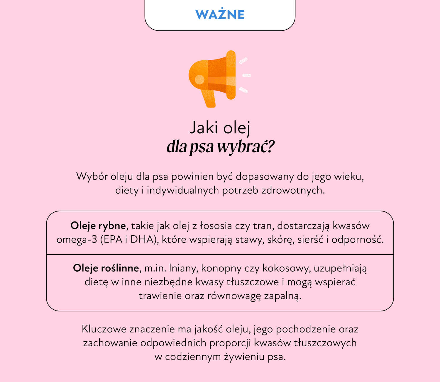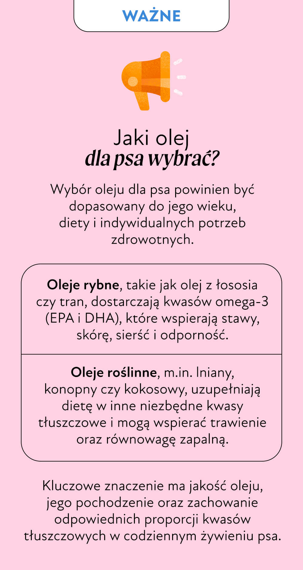 Wybór oleju dla psa powinien zależeć od jego indywidualnych potrzeb zdrowotnych i celu suplementacji. Oleje rybne sprawdzają się przede wszystkim wtedy, gdy zależy nam na wsparciu stawów, skóry, sierści i układu nerwowego. Oleje roślinne mogą być pomocne przy stanach zapalnych, wsparciu metabolizmu lub uzupełnieniu diety w inne kwasy tłuszczowe. Warto także zwrócić uwagę na jakość oleju, jego naturalne pochodzenie oraz regularność stosowania, ponieważ to one decydują o długofalowych efektach.