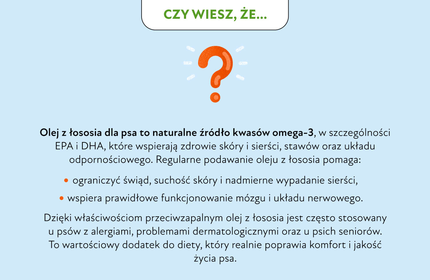 Pamiętaj, że ochrona skóry i włosów to nie tylko nakładanie produktu bezpośrednio na skórę. Ważne jest również odżywienie pochodzące z wewnątrz organizmu. Dajesz w ten sposób możliwość zwierzakowi, by wykorzystał dostarczane mu jakościowe kwasy tłuszczowe do wytworzenia własnych białek i innych niezbędnych dla zdrowego funkcjonowania skóry i sierści substancji. Do takich substancji zaliczamy: