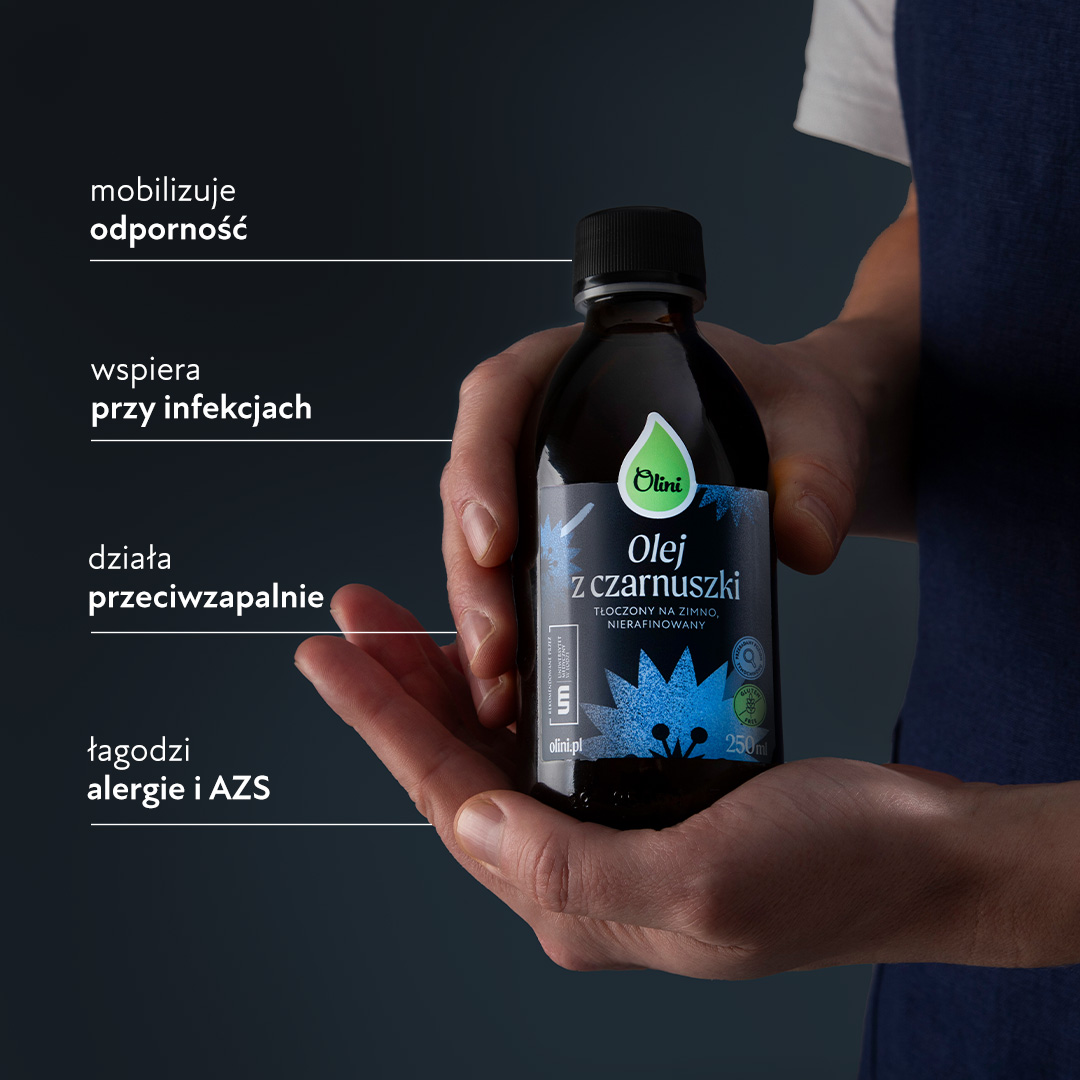 Świeży olej z czarnuszki tłoczony na zimno to źródło wielu cennych, prozdrowotnych składników. Wysoka, przebadana zawartość tymochinonu, najwyższa dbałość o procesy tłoczenia, wyselekcjonowane ziarna czy w końcu staranne przechowywanie – to wszystko znajdziesz w olejach Olini. To produkty, które najpierw gościły na naszych stołach. I którymi – naszym zdaniem – grzech się nie podzielić!