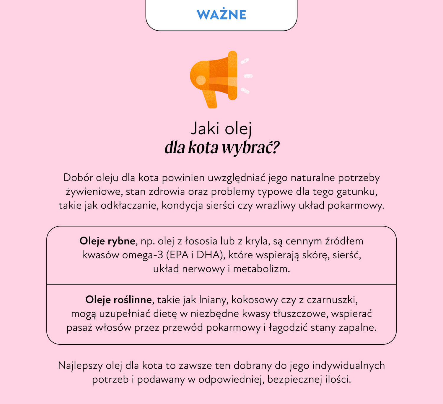 W akapicie powyżej omówiliśmy sobie różnorodne zastosowanie olejów, zarówno rybich, jak i roślinnych w diecie kota. Bazując na tej wiedzy możemy zatem wybrać najlepszy olej na kocie dolegliwości, z którymi niestety, właściciele tych charakternych czworonogów zmagają się bardzo często.
