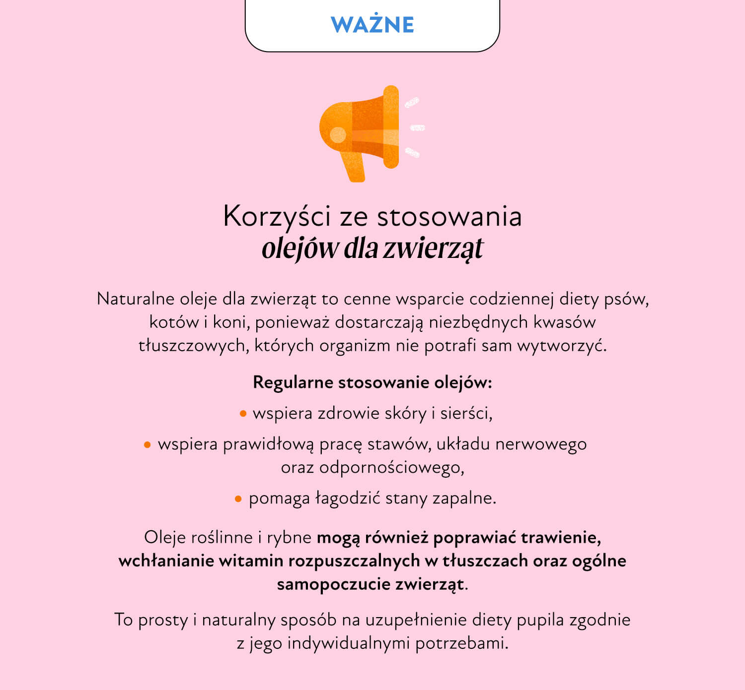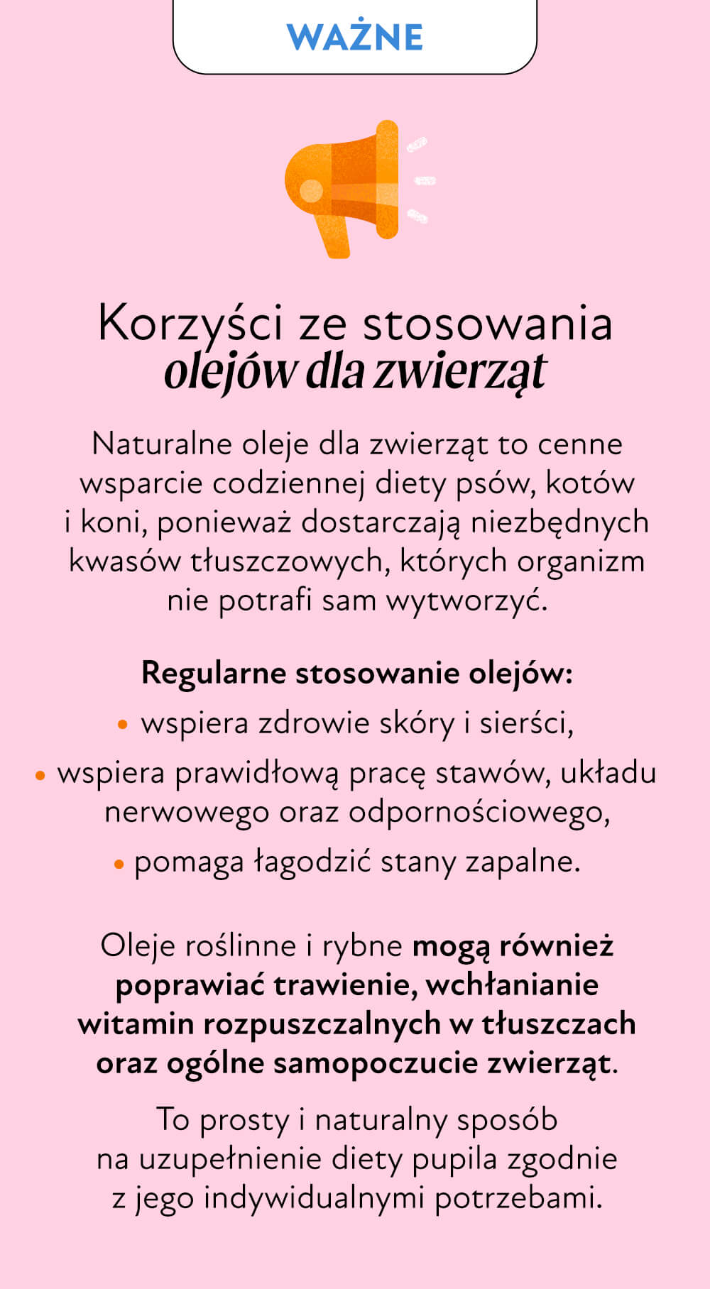 Zanim zdecydujemy się na włączenie takiego oleju omega-3 do diety zwierzęcia, warto porozmawiać z naszym weterynarzem i uwzględnić stan zdrowia zwierzęcia oraz wszystkie przyjmowane przez niego leki. Po takiej konsultacji, jeśli dostaniemy zielone światło do działania, możemy wspomóc naszego czworonoga w takich problemach zdrowotnych jak choroby skóry oraz terapia stanów zapalnych.