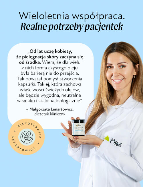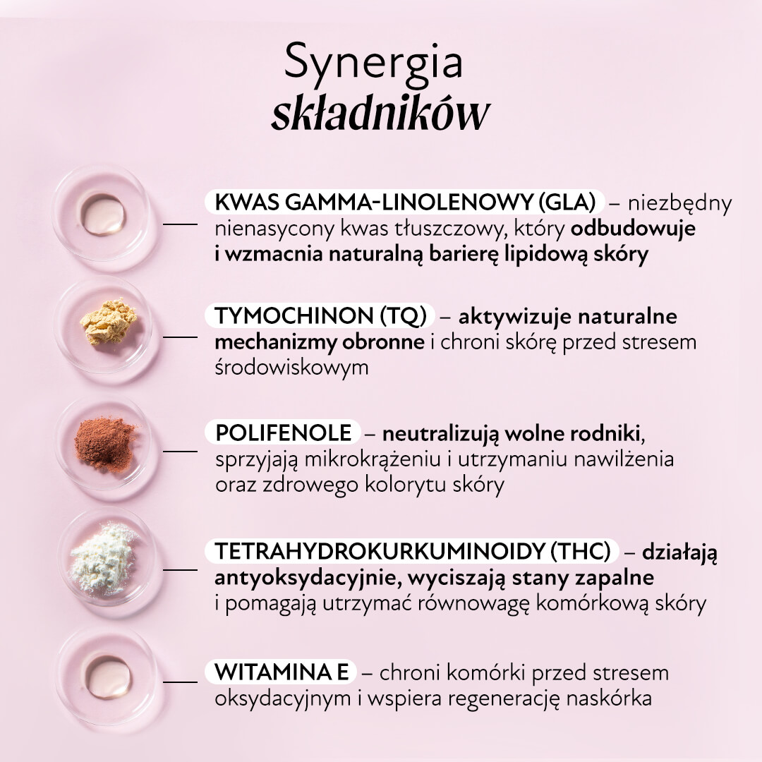Zimnotłoczone oleje i standaryzowane ekstrakty roślinne – synergiczne działanie (kapsułka w kapsułce)Kwasy GLA (min. 85,5 mg) – wsparcie nawilżenia i wzmocnienie bariery hydrolipidowejDziałanie przeciwzapalne – kompleksowo dobrane antyoksydantyInnowacyjny suplement diety stworzony z Małgorzatą Lenartowicz (Dietoterapia Lenartowicz)