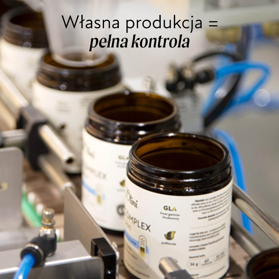Pierwszy element to świeży olej pod produkcję. Olej z wiesiołka tłoczymy bezpośrednio pod produkcję Duo Complex Skin. Łączymy go z olejem z ogórecznika standaryzowanym na 25% GLA (kwasu gamma-linolenowego). I taka mieszanka od razu jest kapsułkowana – nie stoi wcześniej w magazynie.