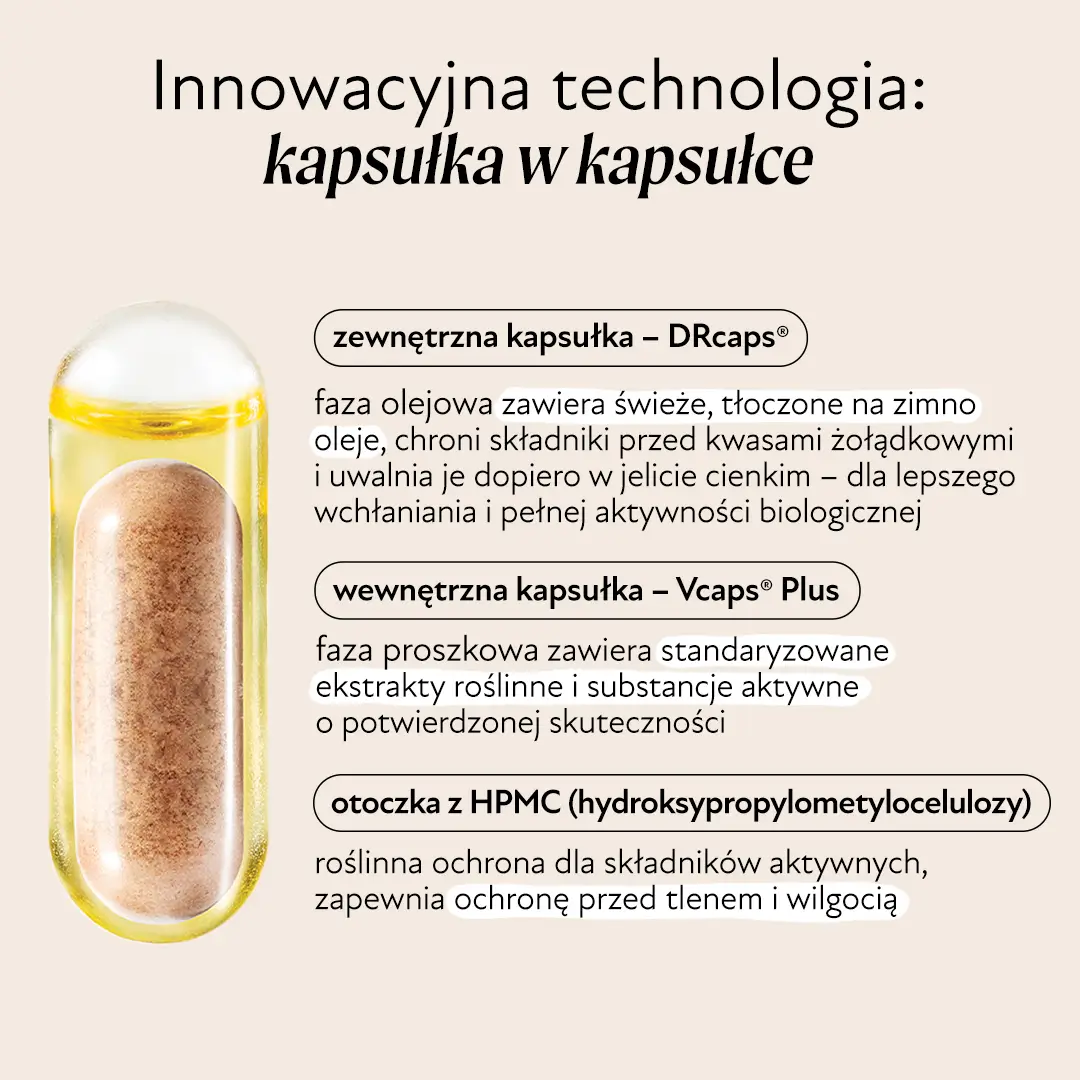 - W środku tej kapsułki zamknięta jest mniejsza kapsułka proszkowa z fazą suchą. W niej znajdują się standaryzowane ekstrakty roślinne, m.in. z czarnuszki (tymochinon), wiesiołka (polifenole) i kurkuminy (w formie tetrahydrokurkuminy).