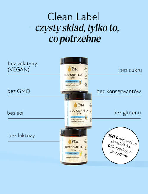 Małgorzata: Tak, można i warto. Oleje w płynie są składnikiem diety – wliczamy je do puli tłuszczów w jadłospisie. DUO COMPLEX Skin jest dodatkowym, skoncentrowanym wsparciem, bo: