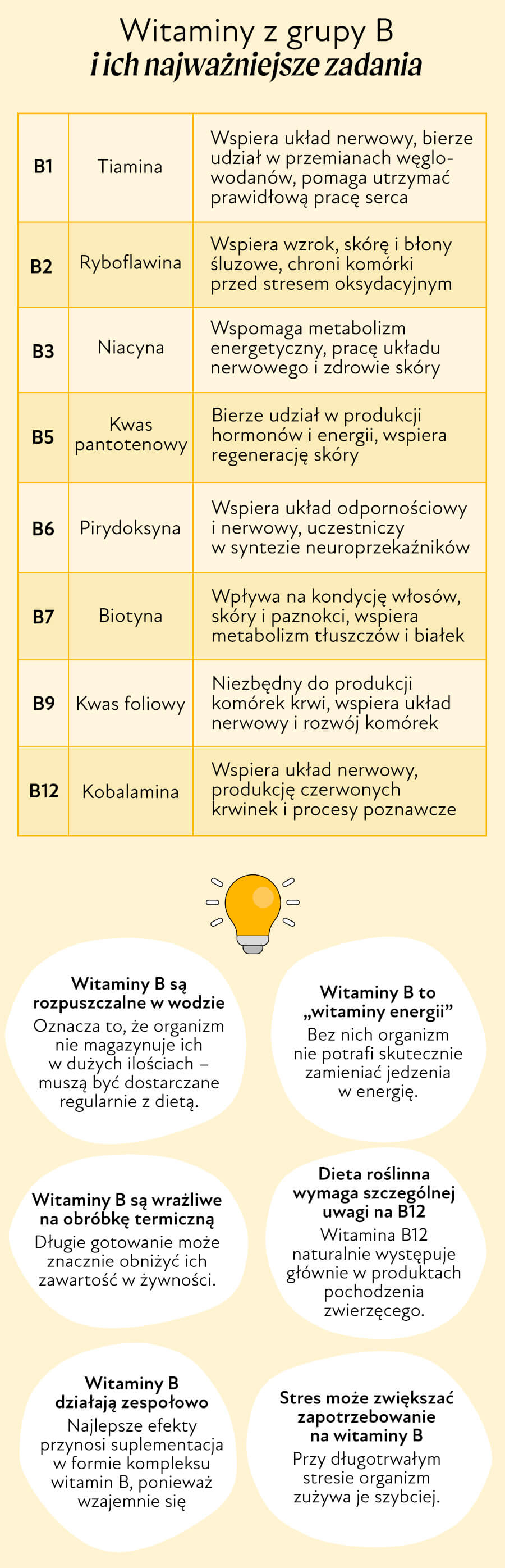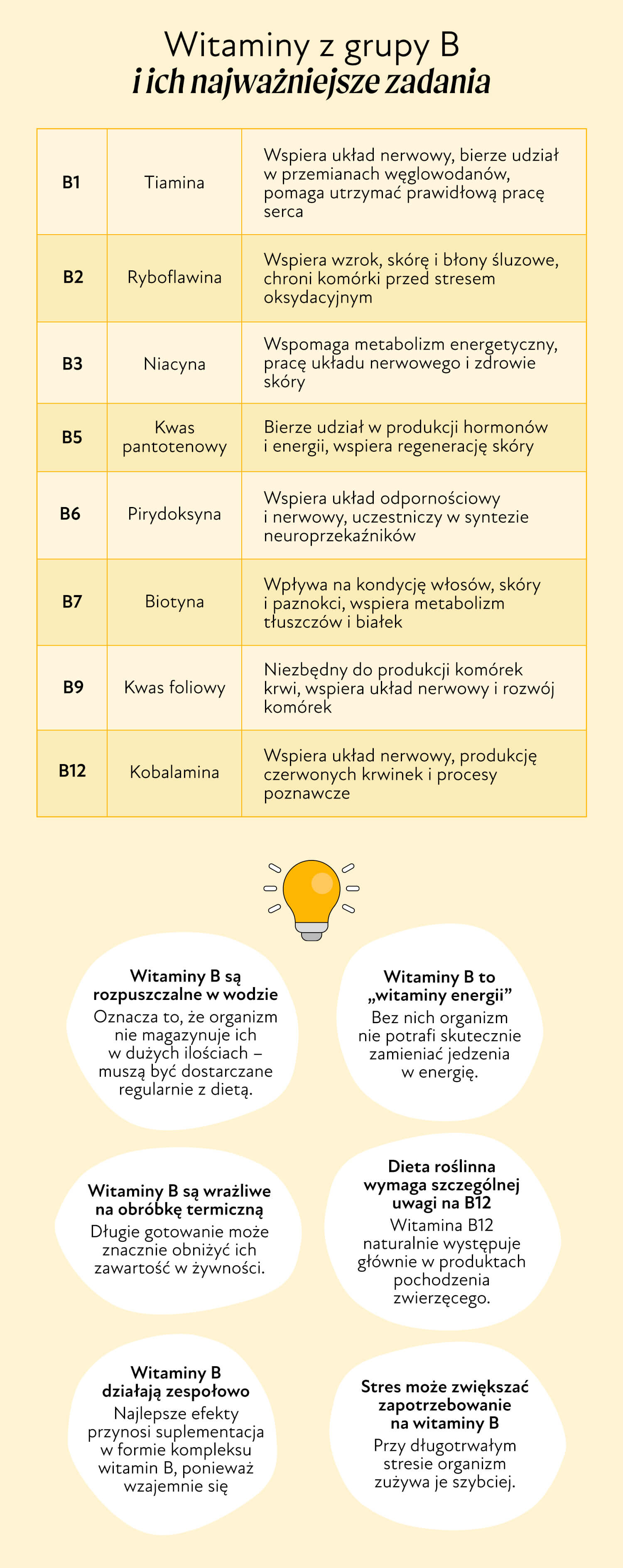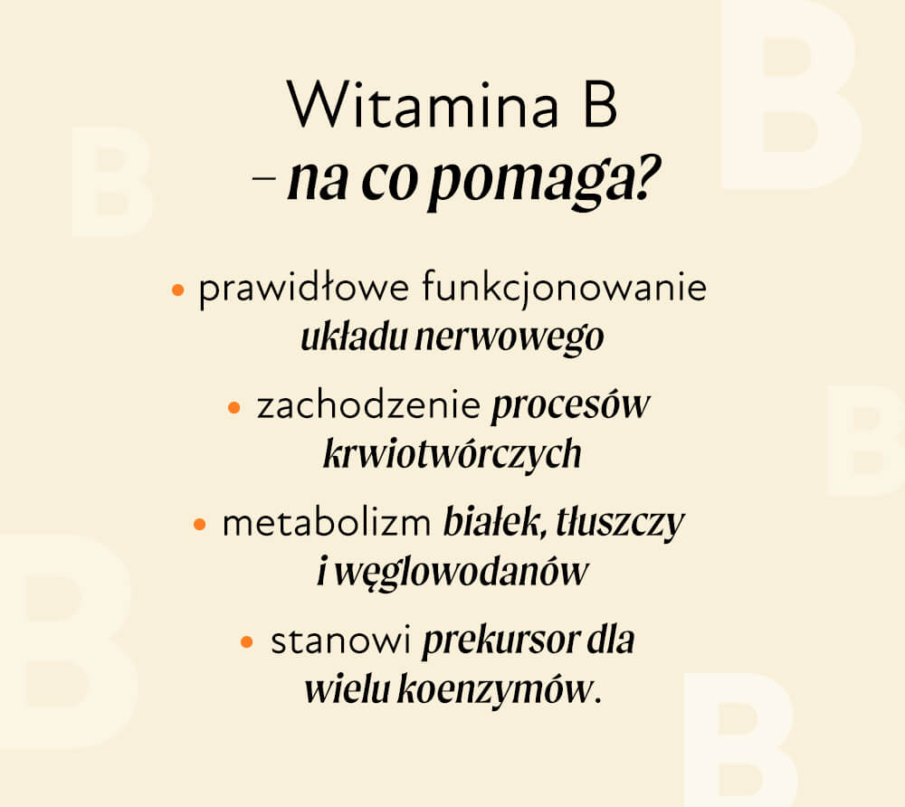 Wyróżniamy cały szereg witamin z grupy B. Ich mnogość sprawia, że jest wiele zarówno pełnionych przez nie funkcji w naszym organizmie, jak i rodzajów pokarmów, z którymi możemy te witaminy dostarczyć. Odpowiedni poziom witamin z grupy B jest istotny dla zachowania prawidłowej pracy układu nerwowego, pozwala także uniknąć anemii z niedoboru witaminy B.