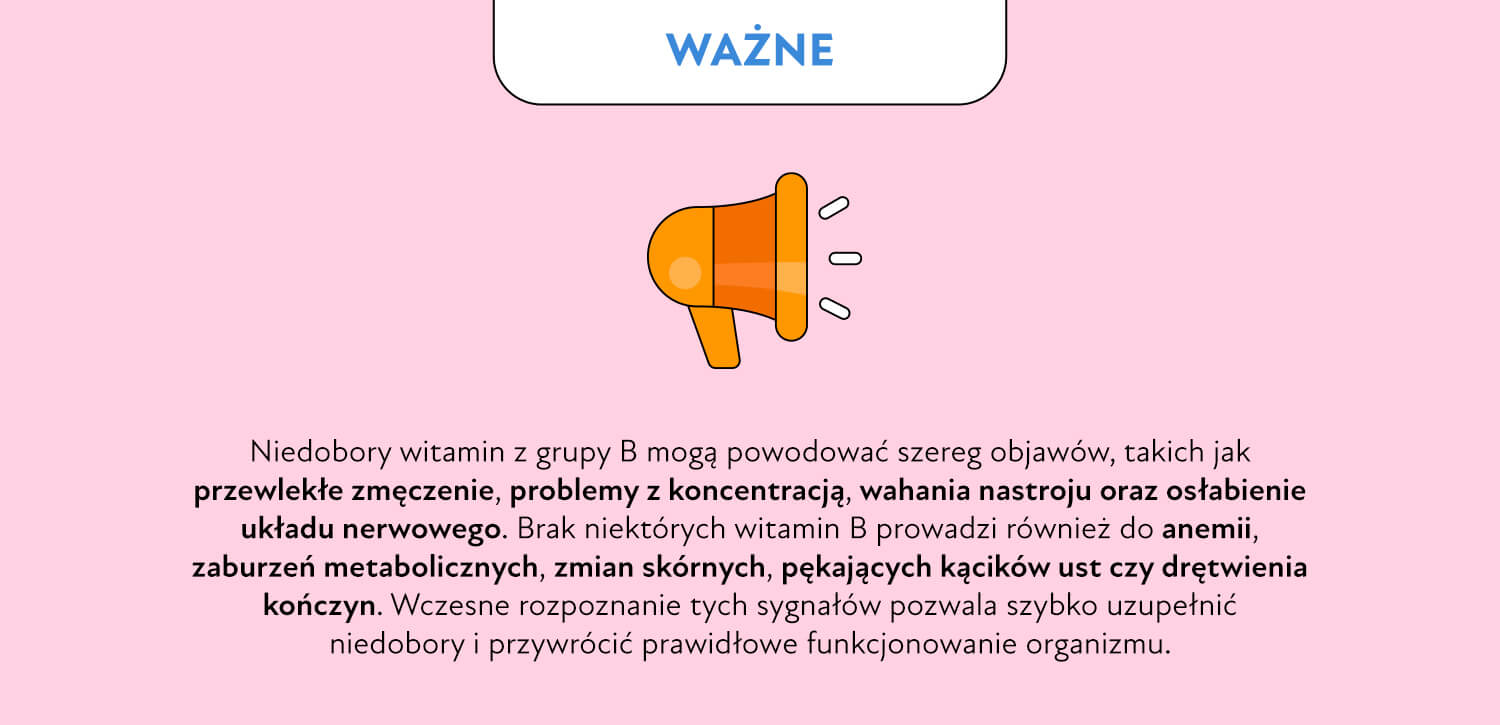 Niedobór witamin z grupy B może powodować zmęczenie, osłabienie, bóle głowy, zaburzenia koncentracji i pamięci, problemy z nastrojem, lęk i objawy depresyjne. Często pojawiają się zaburzenia krwiotworzenia (np. anemia megaloblastyczna), bóle mięśni, dolegliwości skórne, a w cięższych przypadkach także zaburzenia psychotyczne i halucynacje.