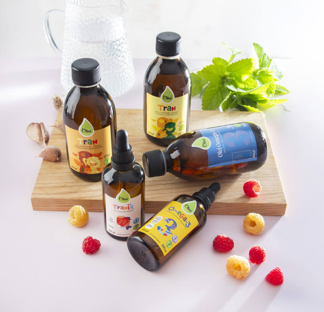 Kluczowe dla przyswajalności witamin ADEK jest przyjmowanie ich razem z tłuszczem. Olini w swojej ofercie posiada mieszanki naturalnych, zimnotłoczonych olejów, będących źródłem witamin. Będzie to suplement na koncentrację i pamięć, taki jak: