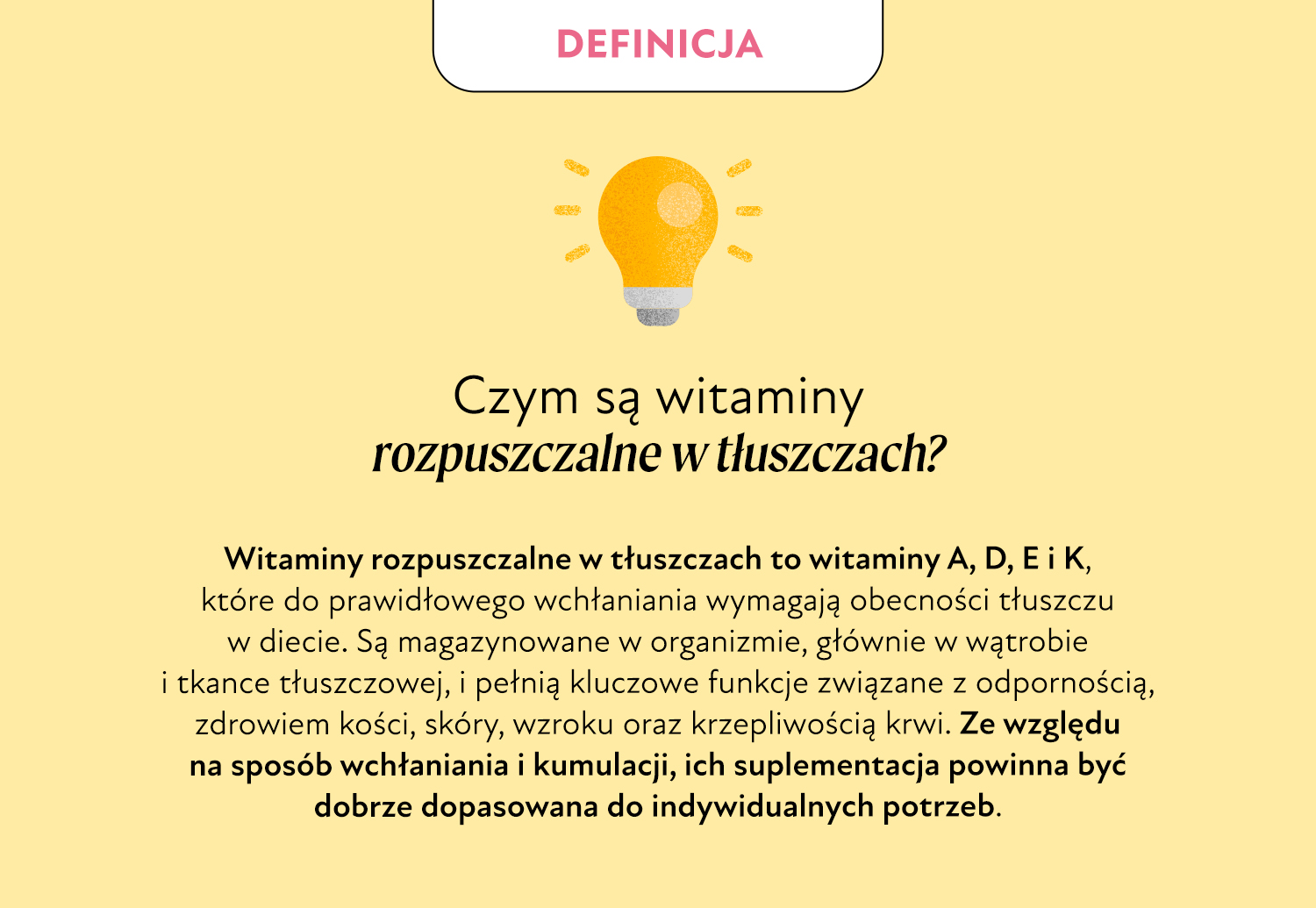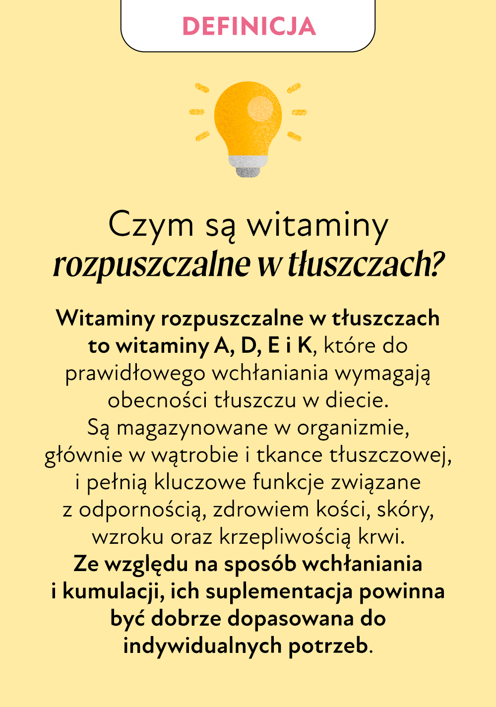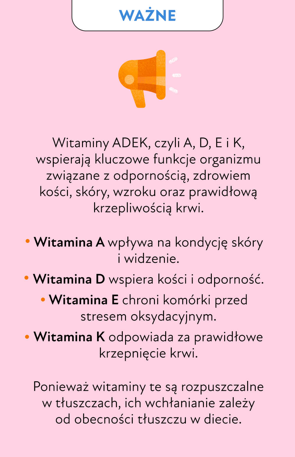 Witamina A, D, E i K są magazynowane w wątrobie i tkance tłuszczowej. Tłuszcz jest substancją, która ma zdolność do ich rozpuszczania. Tutaj liczy się przede wszystkim umiar – niektóre z nich łatwo przedawkować, a ich nadmiar jest szkodliwy (nie są wydalane z moczem). Oczywiście, niedobór witamin ADEK jest również niekorzystny dla zdrowia.