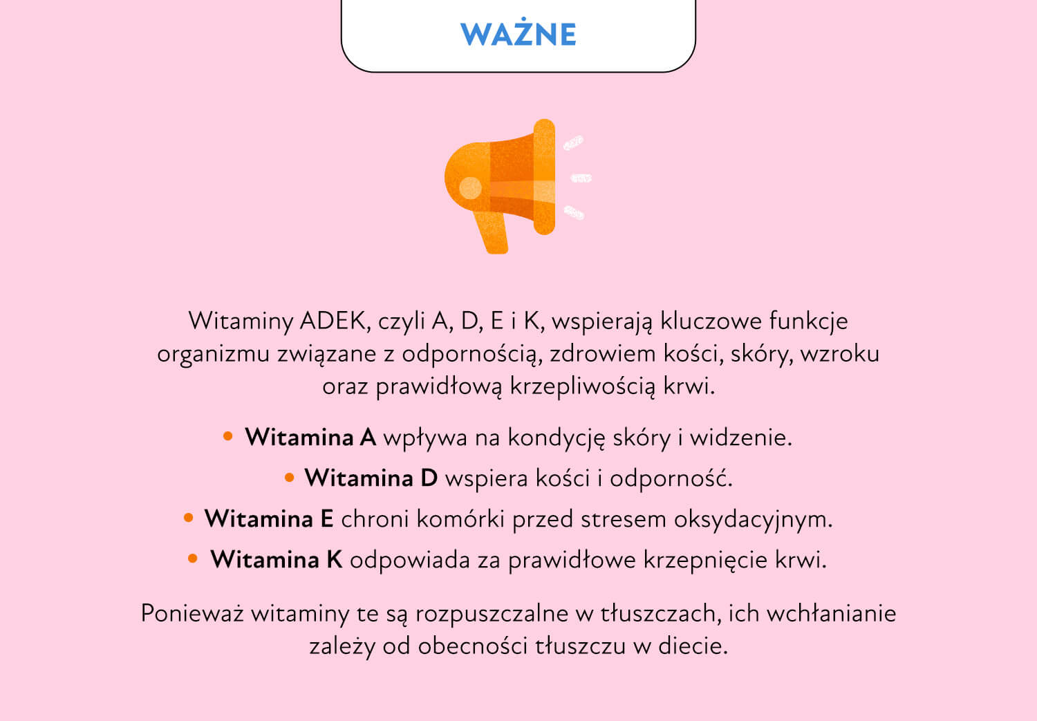 Witaminy ADEK rozpuszczają się w tłuszczach, dlatego bez ich obecności w diecie nie są skutecznie wchłaniane w jelitach. Nawet odpowiednia ilość witamin może nie zostać wykorzystana przez organizm przy diecie niskotłuszczowej. Spożywanie ich razem z dobrej jakości tłuszczami zwiększa biodostępność i efektywność działania.