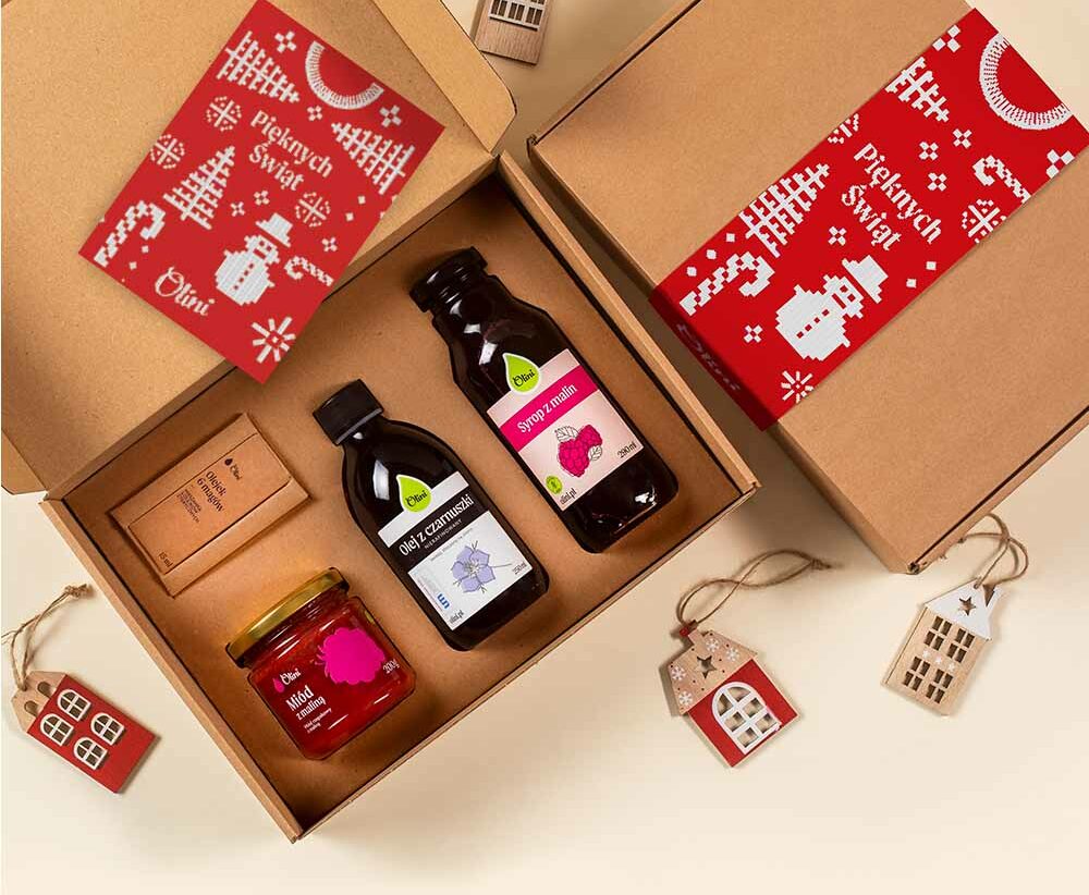 Pudełko z ekologicznego materiału – wytrzymałej tektury – pomieści cztery naturalne produkty od Olini.