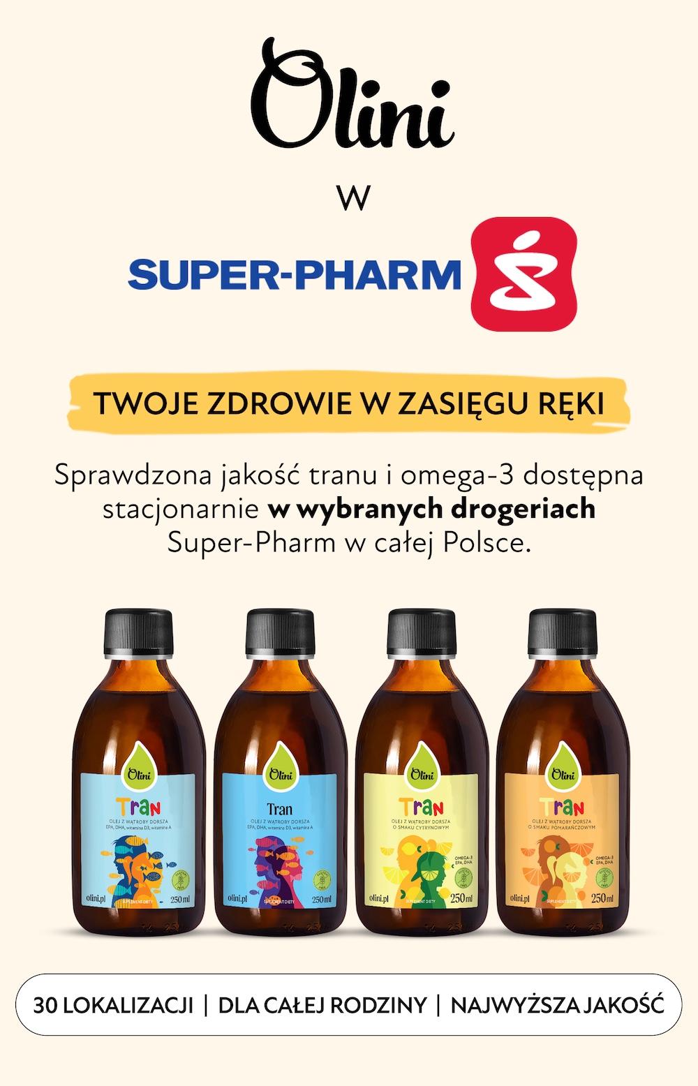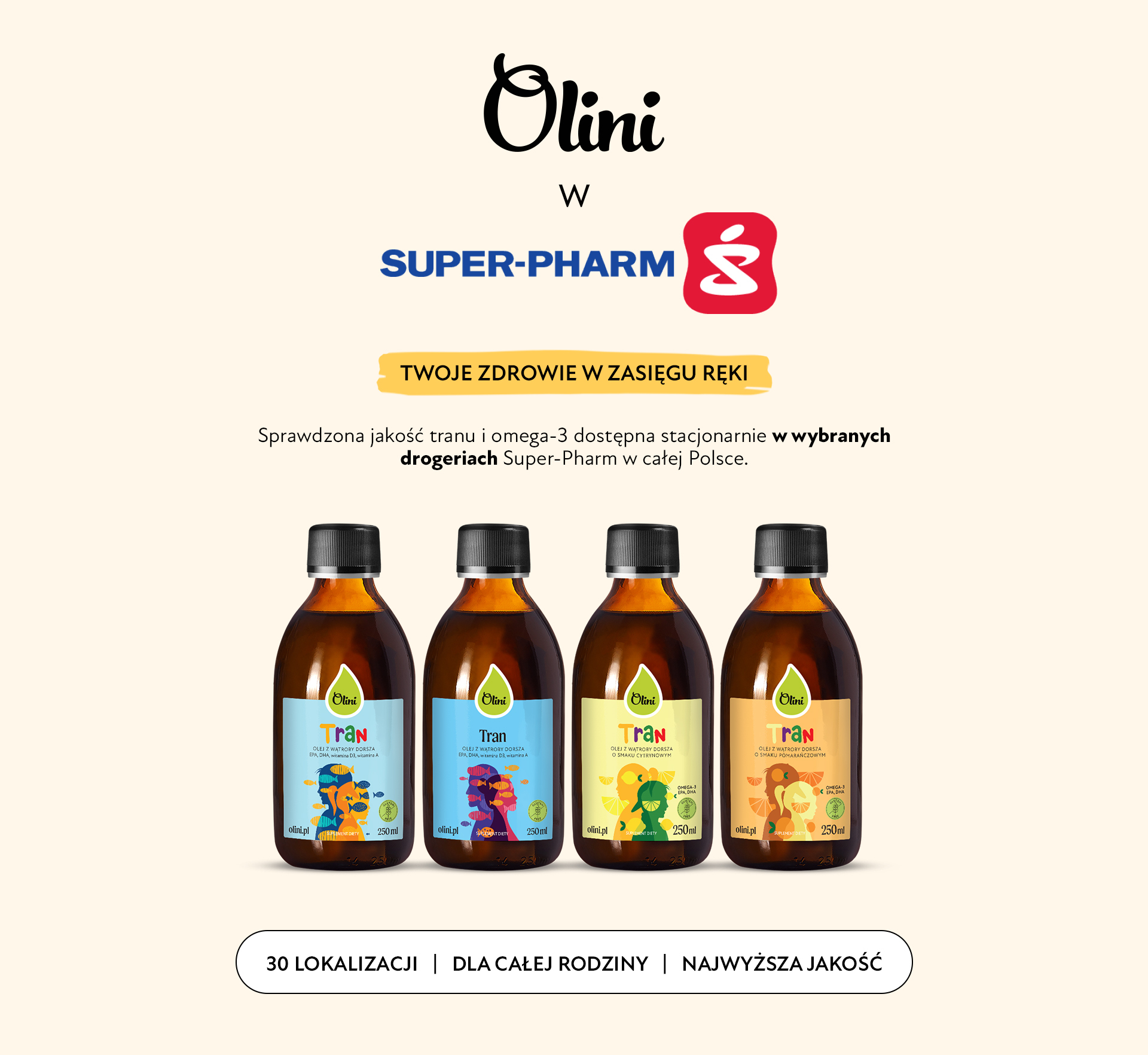 Obecnie we wszystkich 30 wskazanych lokalizacjach Super-Pharm znajdziesz następujące produkty Olini: Tran, Tran dla dzieci oraz Tran cytrynowy.