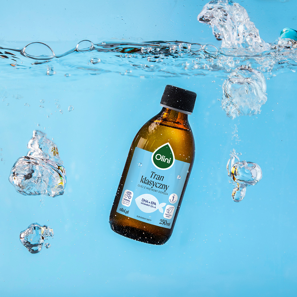 Tran Olini dostarcza trzy ważne składniki odżywcze w jednej porcji (5 ml): witaminę A (1534 µg), witaminę D3 (544 IU) i kwasy omega-3 EPA+DHA (912 mg).