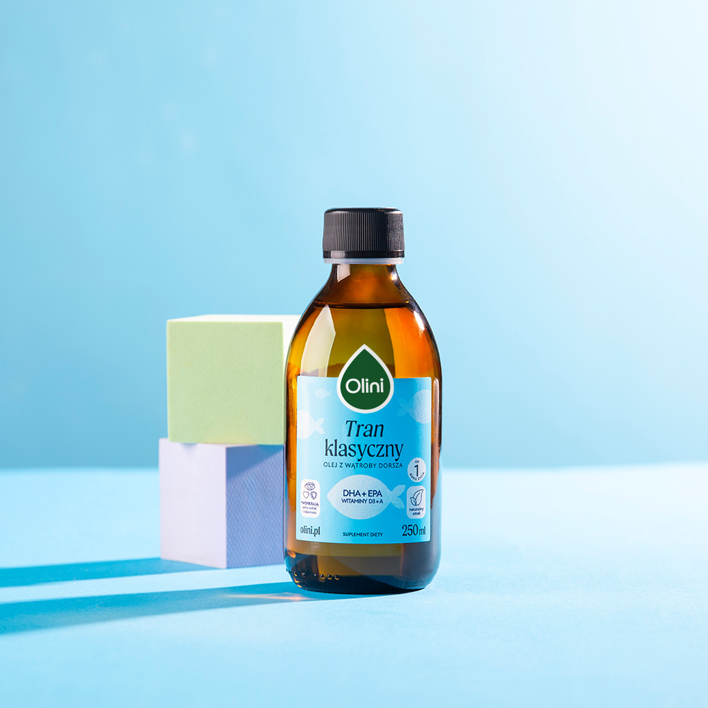 Pij tran z dorsza codziennie i zapomnij, co to katar, kaszel, przygnębienie czy bóle kości. Każda jego łyżeczka to porcja kwasów omega-3 oraz witamin A i D w dużych ilościach. Tran Olini jest czysty i pochodzi z ryb ze zrównoważonych połowów, co potwierdza certyfikat MSC. Ma także delikatny zapach i smak.