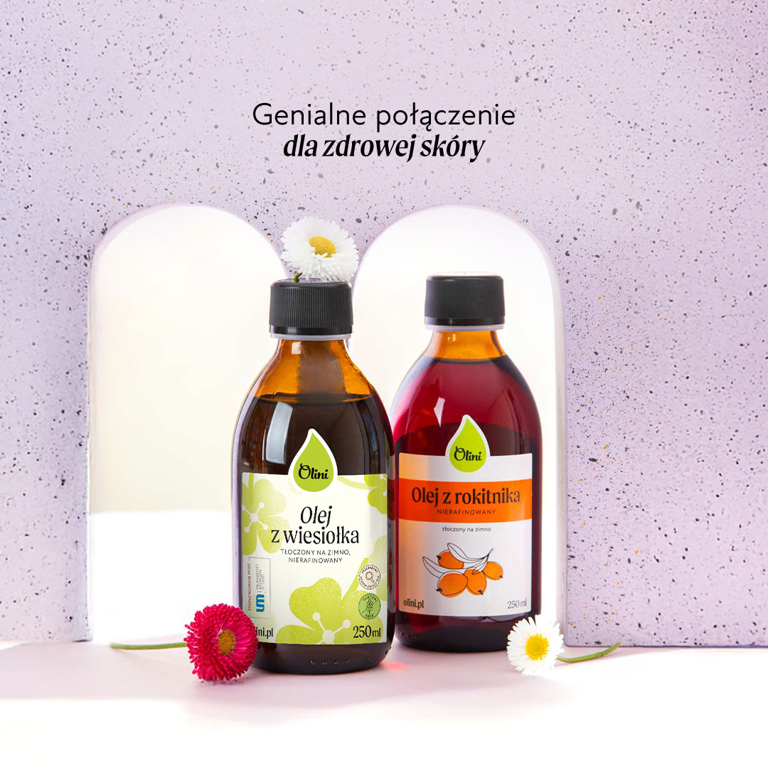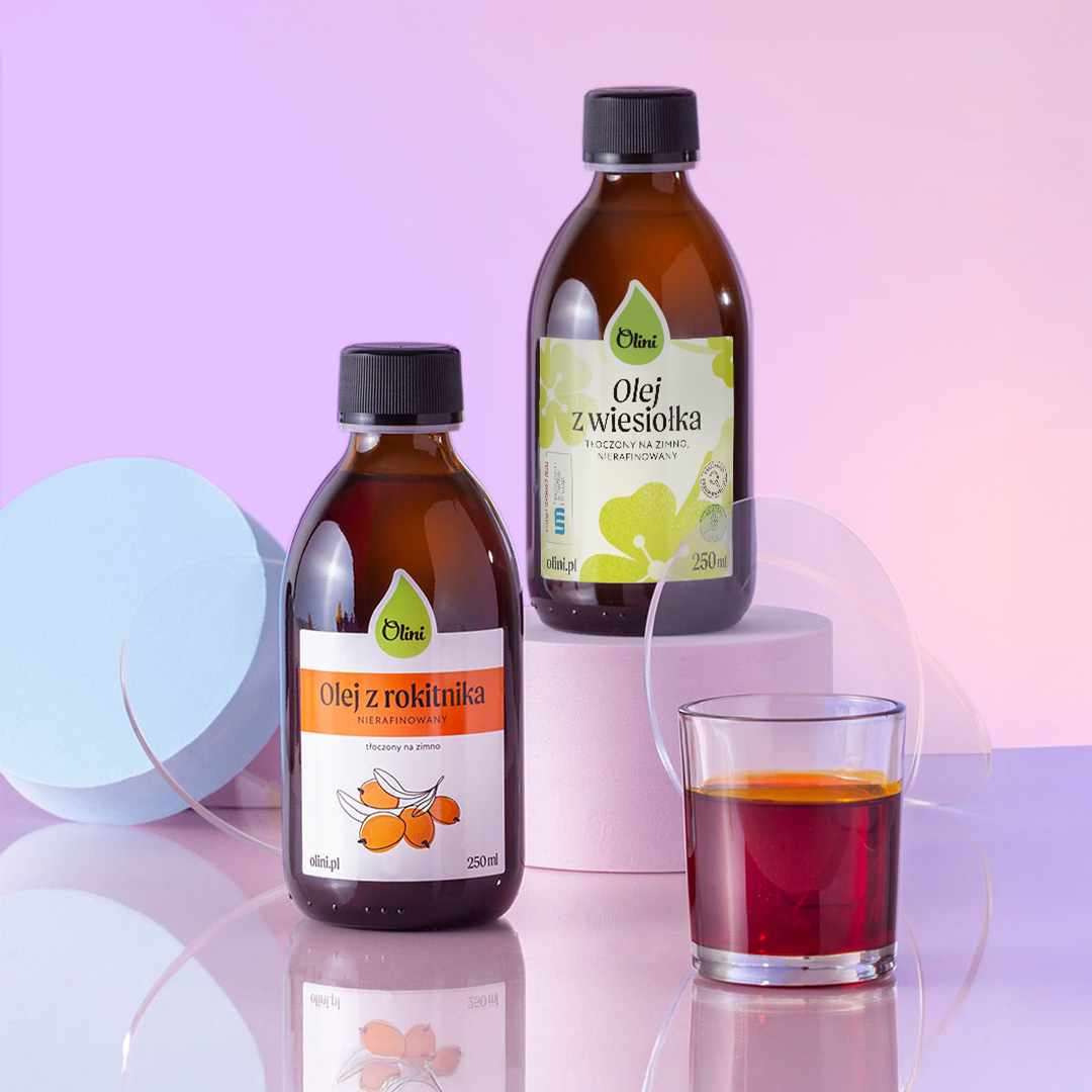 Olej z wiesiołka i olej z rokitnika to oleje bogate w nienasycone kwasy tłuszczowe omega-6 i omega-9. Dlatego dla równowagi warto włączyć do diety także te oleje, które są źródłem kwasów omega-3. Polecamy: olej lniany, olej konopny i olej z pestek winogron.