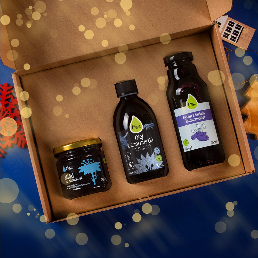 Pudełko z ekologicznego materiału – wytrzymałej tektury – pomieści 3 naturalne produkty od Olini.